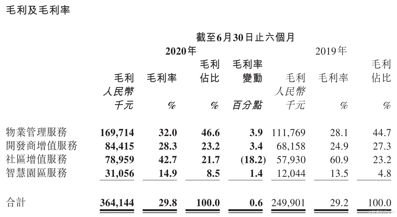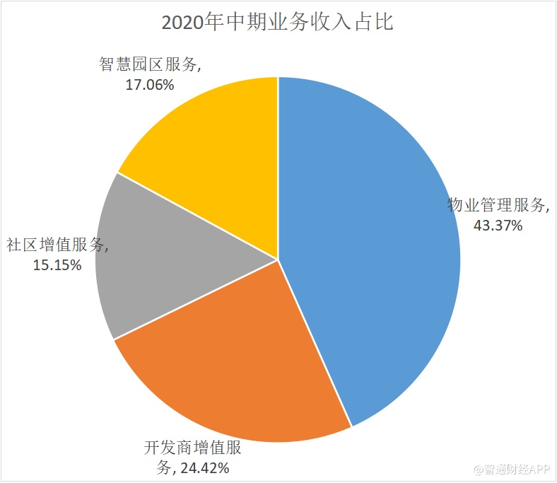 在上述两项业务的增长下,公司社区增值服务、智慧园区服务收入占比分别由2019年中期的11.10%、10.45%上涨至15.15%、17.06%,整体营收结构进一步均衡。
