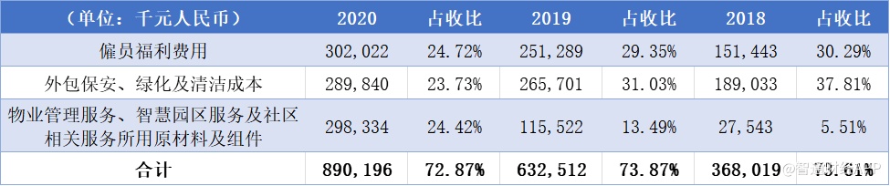 从成本端来看,僱员福利费、外包保安、绿化及清洁成本、及服务所用原材料及组件构成了公司最主要的成本费用,三项费用占总收入比重于近三年均达约73%。