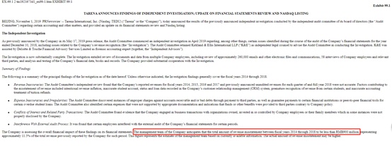 而正由于这份迟迟未能提交2018年年报,达内科技被纳斯达克要求在2019年5月上报。但在2019年4月,达内董事会独立审核委员会宣布公司出现财务问题,后经过纳斯达克准许后,年报披露期延长至2019年10月28日,又在获得了第二次延期后,才于今年4月发布了2018年年报和已经经过修正的2014-2017年报。