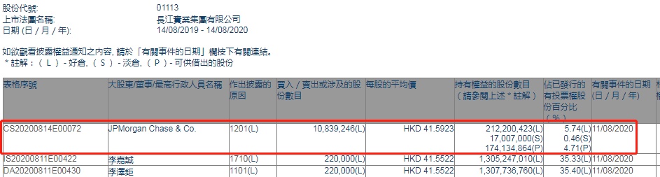 智通财经APP获悉,香港联交所最新资料显示,8月11日,摩根大通减持长实集团(01113)约1083.92万股,每股作价41.5923港元,总金额约为4.51亿港元。智通财经APP获悉,减持后最新持股数目约为2.12亿股,最新持股比例为5.74%。