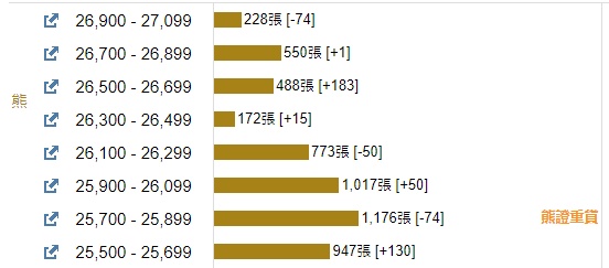 摩根恒指牛熊证街货分布图中的数据显示,熊证街货重货区在25700-25899区间,该区间最新熊证数量为1176张,较上一交易日减少74张。最多新增区在26500-26699区间,该区间最新熊证数量为488张,较上一交易日增加183张。