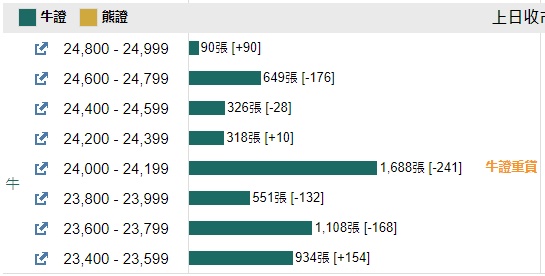 牛证街货重货区在24000-24199区间,该区间最新牛证数量为1688张,较上一交易日减少241张;最多新增区在23400-23599区间,该区间最新牛证数量为934张,较上一交易日增加154张。