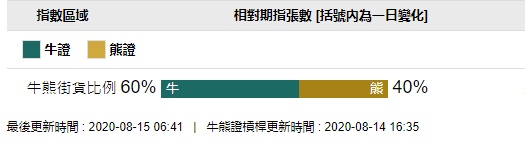 智通财经APP获悉,截至8月14日,恒指最新的牛熊街货比例60:40。