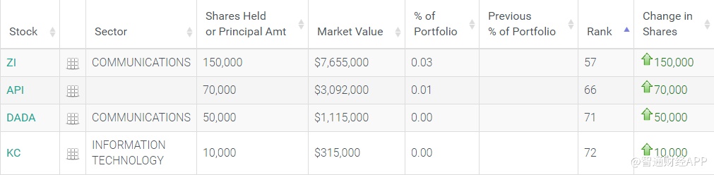 从持仓来看,第二季度,老虎环球基金新买入ZoomInfo Technologies(ZI.US)、中概股声网(API.US)、达达集团(DADA.US)和金山云(KC.US)。