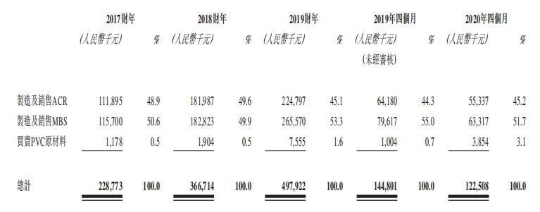 该公司的三个主要业务线为:(i)制造及销售ACR;(ii)制造及销售MBS;及(iii)买卖PVC原材料(该公司向该公司的供应商采购其他PVC原材料再加价转售予该公司的客户)。该公司的大部分收益来自制造及销售ACR及MBS。