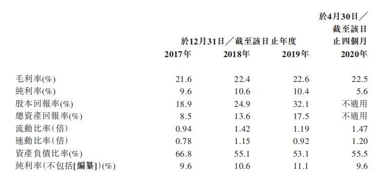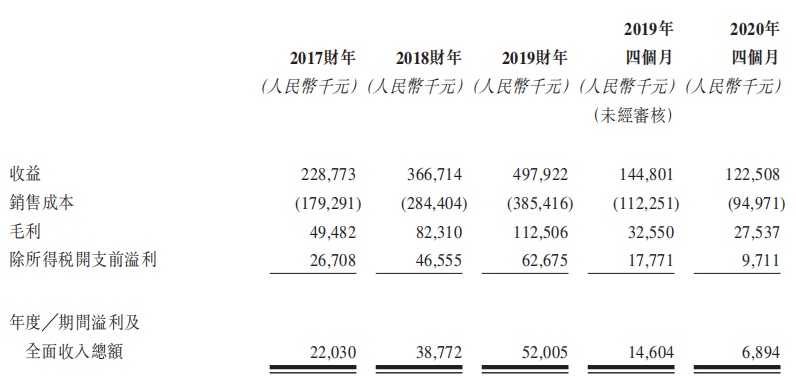 该公司的溢利及全面收入总额由2017财年的约人民币2203万元增至2018财年的人民币3877.2万元,再增至2019财年的人民币5200.5万元,复合年增长率约为53.7%。溢利及全面收入总额由2019年四个月的约人民币1460.4万元减至2020年四个月的人民币689.4万元,减少约 52.7%