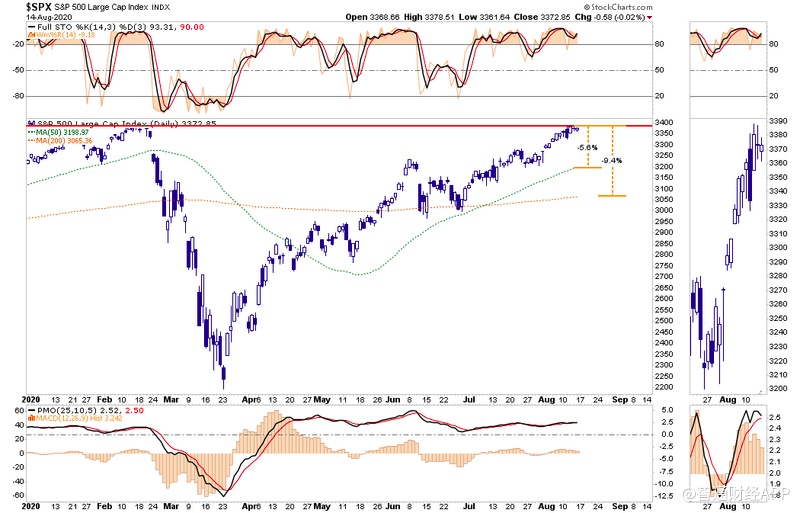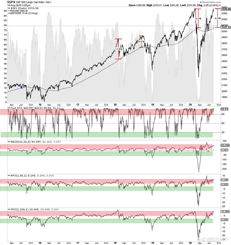 目前标普目前的交易价格比200日均线高出9%以上,所有指标都显示超买状态,值得警惕潜在的短期回调风险。