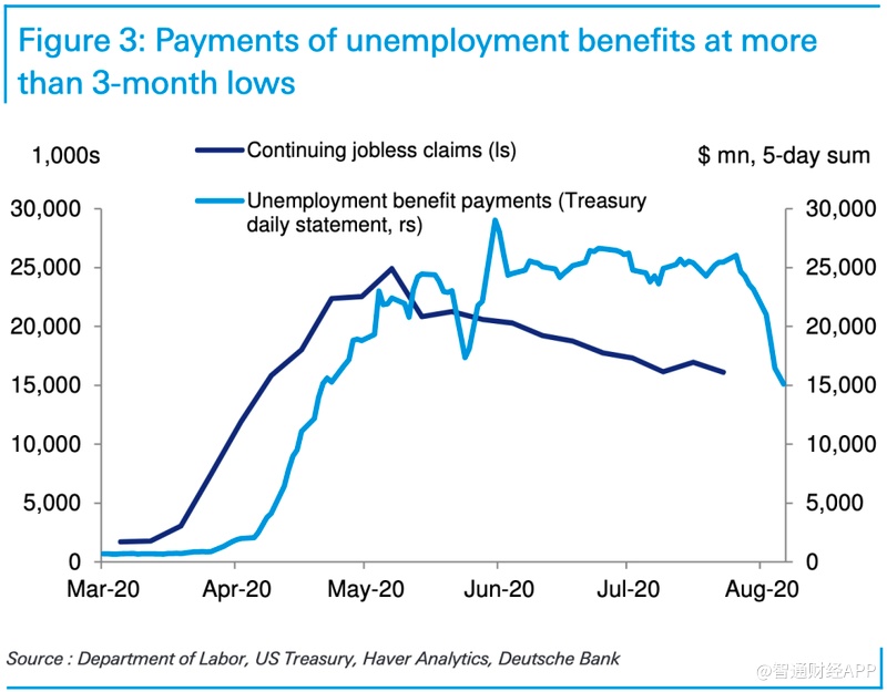 虽然白宫此前宣布将采取行政行动,从CARES法案中重新分配未使用的预算,以补充现有的失业救济计划,但仍然存在挑战。如下图所示,目前不仅没有额外的1200美元支票发放到美国家庭手中,其他补贴也在大幅下降。