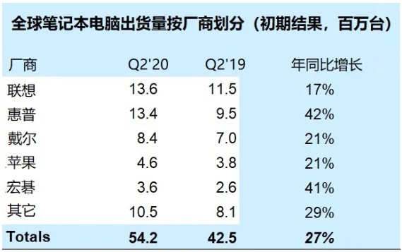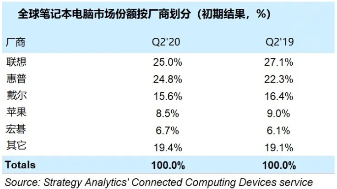 数据显示,2020年第二季度,全球笔记本电脑出货量同比增长27%。其中联想(00992)和惠普(HPQ.US)全球笔记本电脑出货量分别为1360万台和1340万台,同比增长17%和42%;全球笔记本电脑市场份额分别为25%和24.8%,同比增长27.1%和22.3%。按市占额来算,联想和惠普合计接近50%。