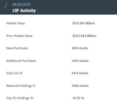 二季度,文艺复兴持仓总市值为1158.4亿美元,上一季度(Q1)为1029.6亿美元,环比增长12.5%。二季度文艺复兴持仓新增标的588只,增持1425只,减持1366只,并对604只标的进行了清仓处理。截止至2020年6月30日,该基金前十大持仓标的占总市值的14.35%,较上季度的15.13%略有降低。
