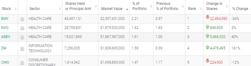 前五大重仓股中:百时美施贵宝(BMY.US)位列第一,持仓约4349.7万股,持仓市值约25.6亿美元,较上季度持仓数量减持了34%。