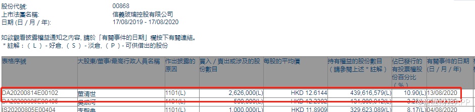 智通财经APP获悉,香港联交所最新资料显示,8月13日,执行董事兼行政总裁董清世及一致行动人增持信义玻璃(00868)262.6万股,每股作价12.6144港元,总金额为3312.54万港元。智通财经APP获悉,增持后最新持股数目约为4.4亿股,最新持股比例为10.9%。