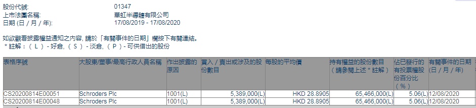 智通财经APP获悉,香港联交所最新资料显示,8月12日,Schroders Plc增持华虹半导体(01347)538.9万股,每股作价28.8905港元,总金额约为1.56亿港元。智通财经APP获悉,增持后最新持股数目为6546.6万股,最新持股比例为5.06%。
