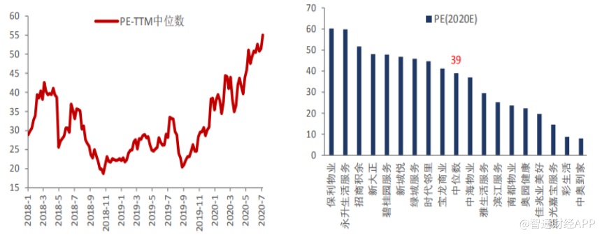 2018年以来,港股物业公司的估值走势呈上升趋势,近期物业股动态市盈率中位数已达50-60倍的区间,2020年业绩对应市盈率的中位数也达到39倍。