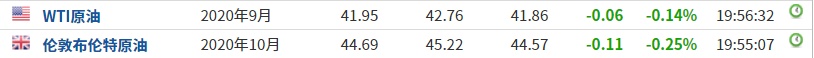 截至发稿,WTI原油跌0.14%,报41.95美元/桶。布伦特原油跌0.25%,报44.69美元/桶。