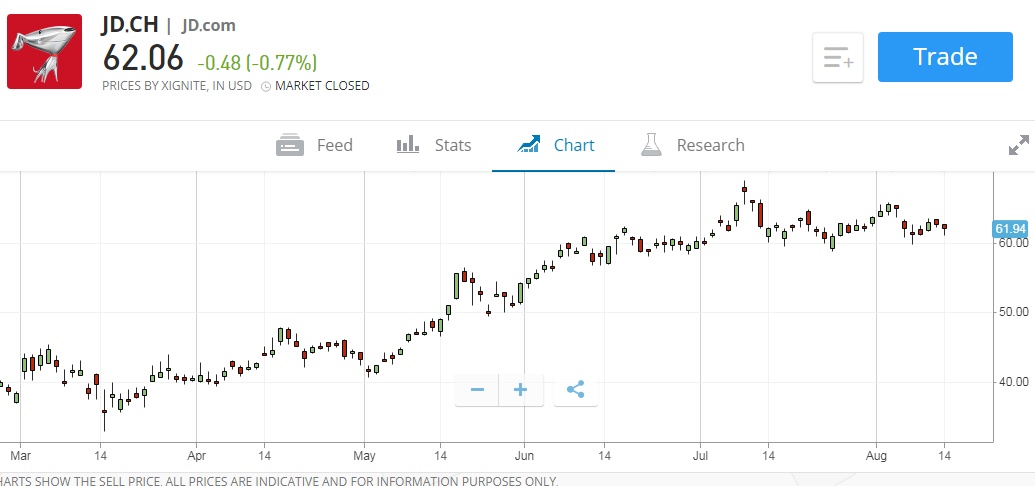 智通财经APP获悉,8月17日(周一)美股盘前,京东集团(JD.US)公布二季度业绩超预期,股价上涨,截止北京时间20:15,该股涨4.42%,报64.8美元。