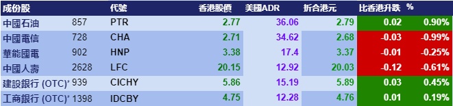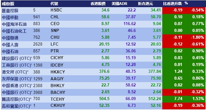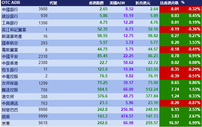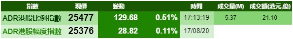 智通财经APP获悉,周一美股三大指数涨跌不一,但港股ADR指数全日向上,按比例计算,收报25477点,升129.68点或0.51%。