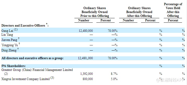Greatest Group (China) Financial Management Limited持有139.2万股普通股,持股比例为8.7%。Hongji Lin对该实体持有的股份行使表决权和处置权。