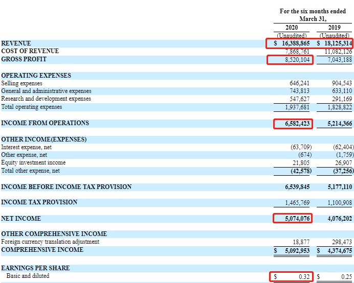 根据招股书中的财务报表,在截至2020年3月31日的6个月,大自然药业未经审计的营收为1638.9万美元,同比下滑9.6%;毛利润为852万美元;营业利润658万美元。净利润为507万美元,基本和摊薄后每股收益为0.32美元。