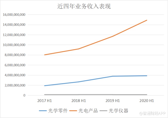 具体业务表现来看,光电产品事业收入于近四年以来一直为公司最主要的收入来源。2020年上半年,光电产品事业收入也为公司三大业务中增速最快的业务,较去年同期增长约27.3%,主要由于手机摄像模组的出货量增加。据最新财报显示,公司光电产品事业收入占比已达到近80%水平。