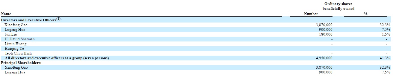 董事会主席、首席执行官Xiaofeng Gao持股占比为32.3%。