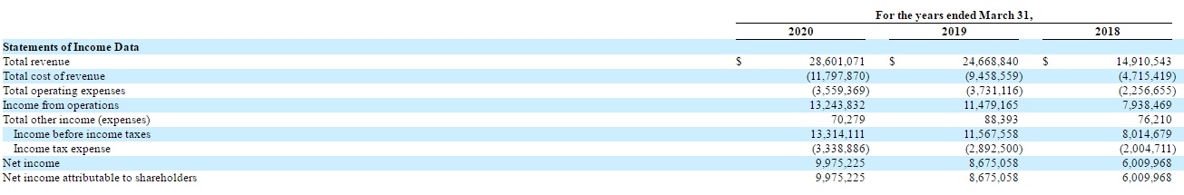 智通财经APP获悉,王道科技(EDTK.US)于8月18日向美国证券交易委员会(SEC)提交了20-F年度报告,披露了截至3月31日的2020财年财务业绩及最新股权结构。