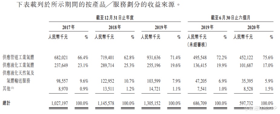 该公司主要产品为空气分离装置生产的管道工业气体。管道工业气体的供应产生的收益分别占截至2017年、2018年及2019年12月31日止年度以及截至2020年6月30日止六个月的总收益约66.4%、62.8%、71.4%及75.6%。于往绩记录期内,公司所有的管道工业气体供应收益均来自对河钢成员集团的成员公司的销售。