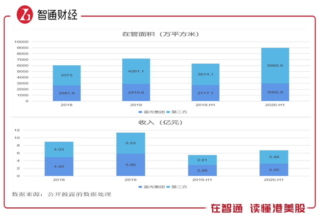 蓝光嘉宝服务通过第三方的收购,来自于第三方的在管面积已超过母公司。2020年上半年,其来自第三方为5985.6万平方米,是母公司的1.99倍,占比在管面积66.6%。