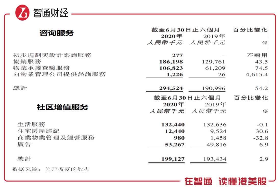 该公司的咨询服务主要包括协销服务、物业承接查验服务、初步规划与设计咨询、及向物业管理公司提供咨询服务,主要收入为前两项业务,上半年分别录得43.5%及74.5%的增长。而社区增值服务主要包括生活服务、住宅房屋经纪、商业物业管理及经营以及广告,报告期内录得收入1.99亿元,较去年同期增长2.9%。