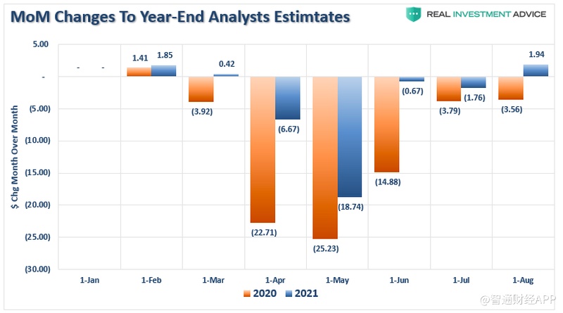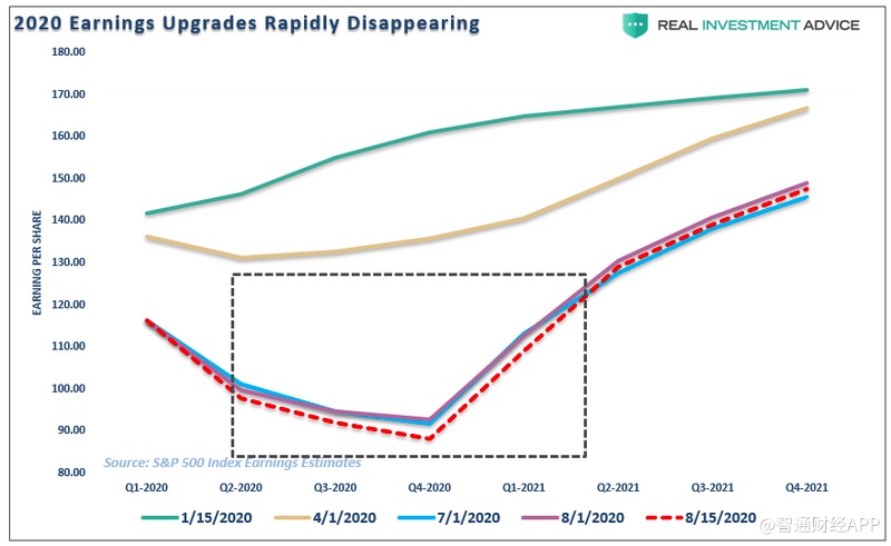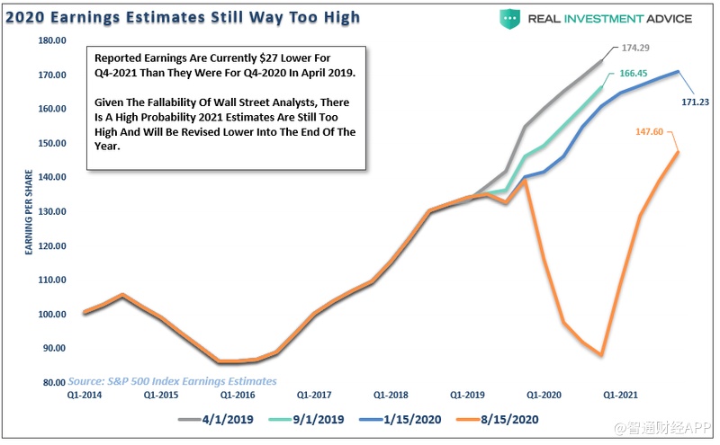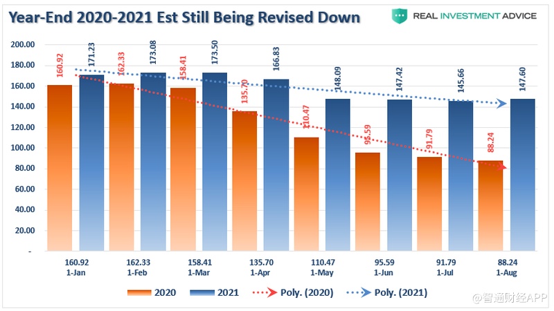 在1月和2月,市场对标普500指数2021年底的每股收益预测为171美元,美股当时刷新历史高点。如今,投资者为2021年的盈利支付了同样的价格,而每股收益却低了20美元。虽然8月初盈利修正后确实有所上升,但到2020年底的预期值仅在2周后就创下新低。