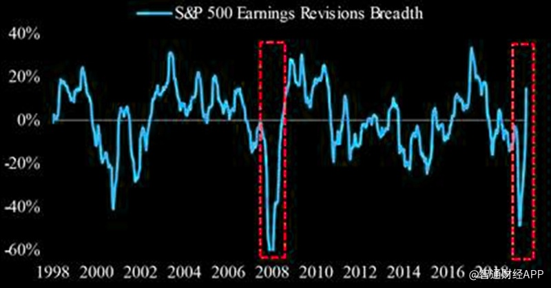 智通财经APP了解到,“预期上调”被多头吹捧为支持高估值的明确证据。下图显示了分析师对标普500指数盈利的“修正广度”。