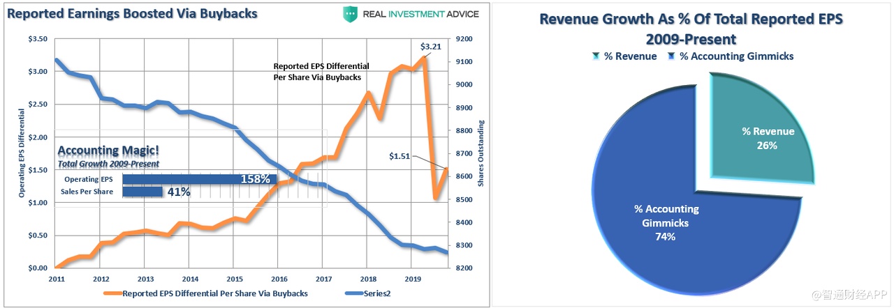重要的是,虽然流通股数已经达到新低,但盈利也已经崩溃。但如果不是因为股票回购,每股收益的下滑会更严重。罗伯茨指出,近75%的报告盈利来自“会计噱头”与实际“营收”增长。