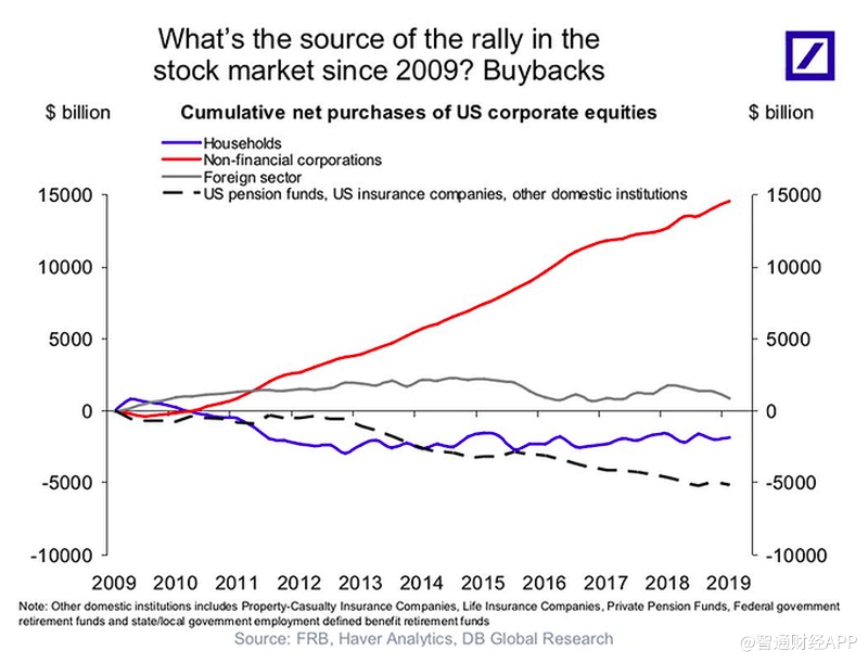 其次,罗伯茨表示,未来市场看涨趋势将是股票回购,以保持市场的重要支撑。但对于投资者来说真正的问题是,几乎100%的股票净买入都来自企业(如下图红线所示)。