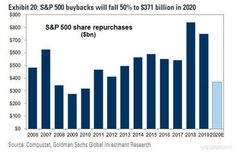 如今随着企业在经济衰退的情况下节约现金,股票回购数急剧下降。如下图所示,标普500指数成分公司的股票回购在2020年将下滑50%至3710亿美元。