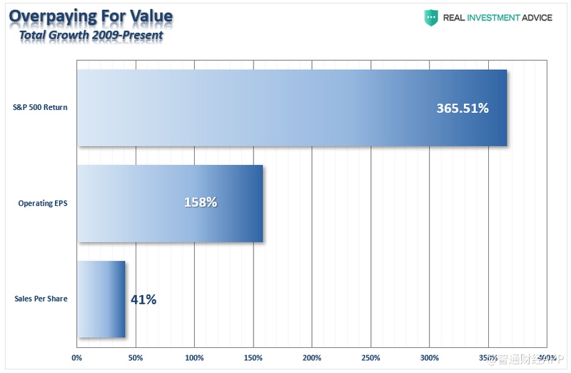 2009年以来,企业每股营业收益仅增长了158%,但收益增长并不是来自于营收增加。在此期间,因减持股份而得到提升的销售额仅有41%的边际增长。