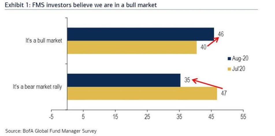 46%的受访者认为美股现在处于牛市,高于7月调查的40%。