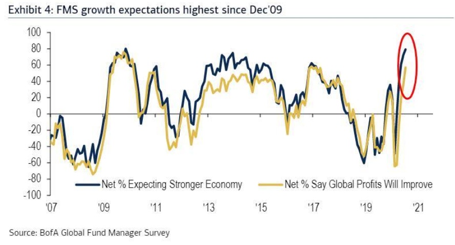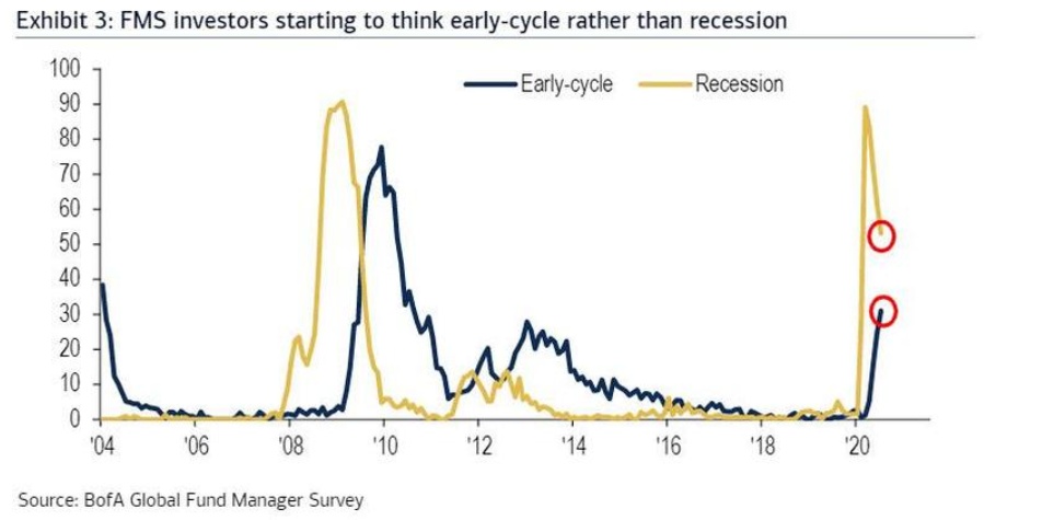 通过每月不间断地向市场注入800亿美元,美联储成功地将“衰退”的普遍共识转变为“周期的早期阶段”。事实上,在上次的调查中,53%的受访者相信前者,而高达31%的人相信后者,是自金融危机以来最多的一次。