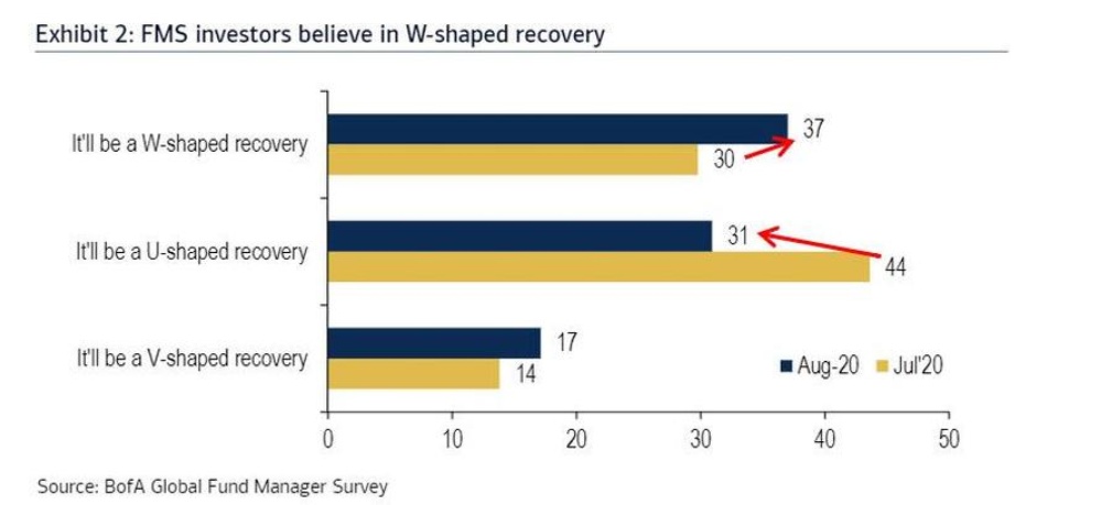 虽然现在乐观情绪盛行,但只有一小部分人(17%)预计经济会出现“V型”复苏,更多人预计会出现“W型”复苏(37%)或“U型”复苏(31%)。
