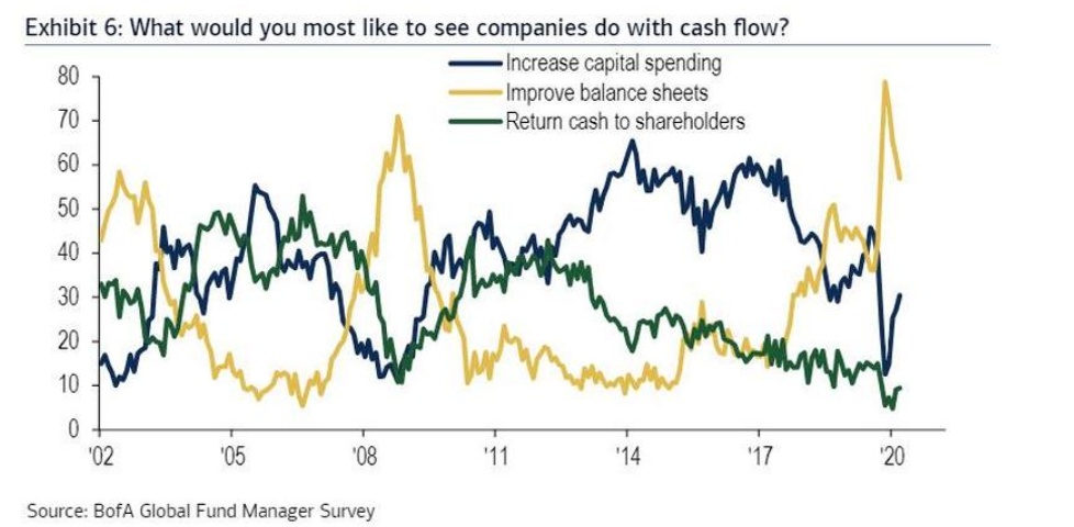 57%的受访者希望公司削减债务以改善资产负债表,30%希望增加资本支出,几乎没有人要求回购股票和派息,因为他们认为美联储的大规模购买已经将股价推至历史新高。