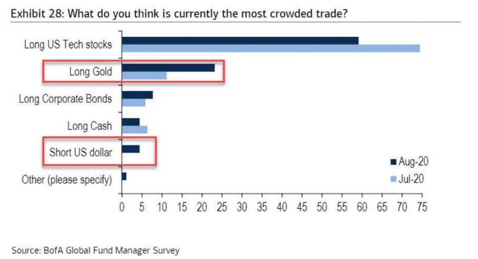 59%的受访者认为当前市场上最拥挤的交易为“做多美国科技股”,23%认为是“做多黄金”,8%认为是“做多公司债券”,而4%认为是“做空美元”。