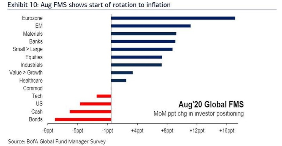 其结果是,资产配置依旧向美国成长型股票倾斜。但8月份的调查结果显示,投资者正转向“通胀资产”:欧洲和新兴市场股票(预期美元贬值)、银行、小盘股和价值型股票。