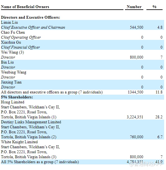 董事Wei Wang通过White Knight Limited持有80万股普通股,持股比例为7%。