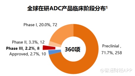 据智通财经APP了解,目前全球已有10个ADC药物上市,其中仅有2個在中国上市,分别为罗氏赫赛莱、武田制药安适利,两者均为进口药,价格极为昂贵。而ADC在研药物中约95%产品处于临床早期阶段,仅有8家进入临床III期,其中包括东曜药业的TAA013。