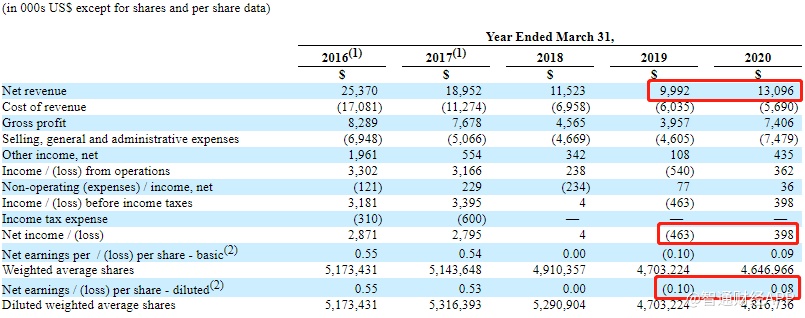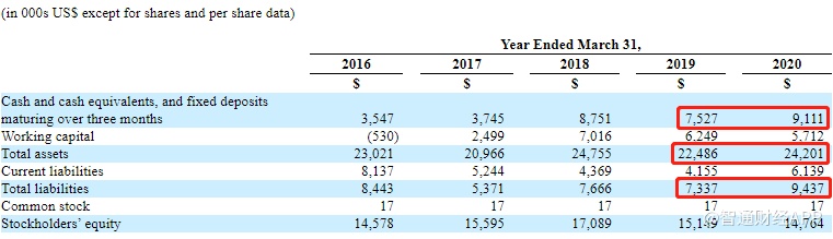 截至2020年3月31日,公司总资产为2420.1万美元,上年同期为2248.6万美元;持有现金及现金等价物,以及三个月以上的定期存款911.1万美元,上年同期752.7万美元; 公司总负债为943.7万美元,上年同期为733.7万美元。