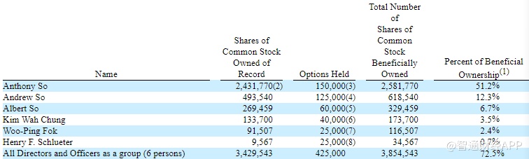年报显示,公司的首席执行官和董事会主席Anthony So实益持有的普通股总数为2,581,770股。以截至2020年7月15日流通在外的4,893,123股普通股计算,持股比例为51.2%。