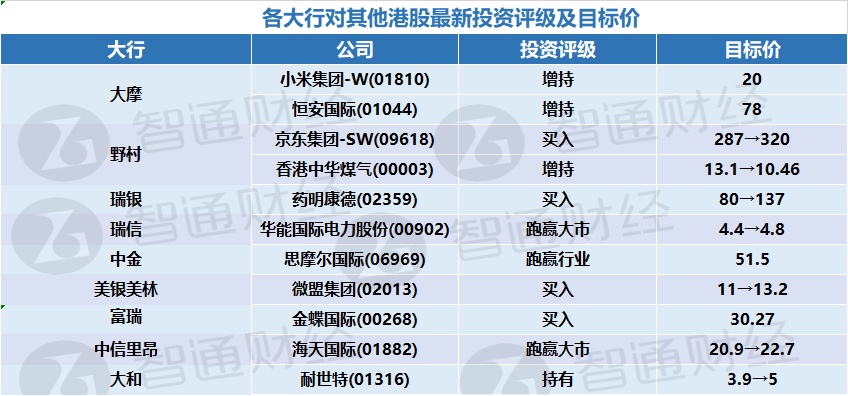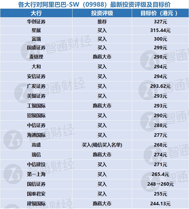 一、各大行对阿里巴巴-SW(09988)最新投资评级及目标价