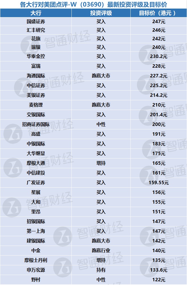 二、各大行对美团点评-W(03690)最新投资评级及目标价