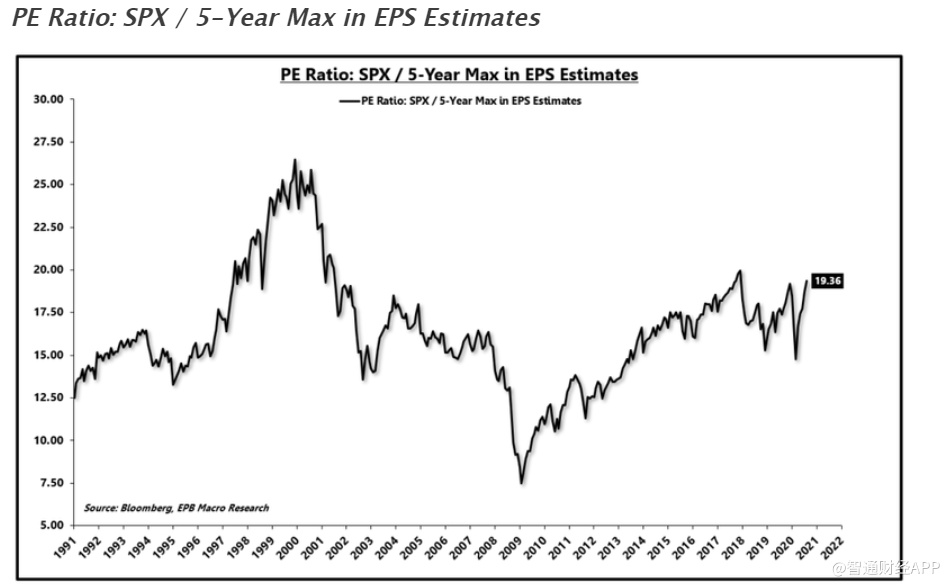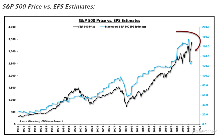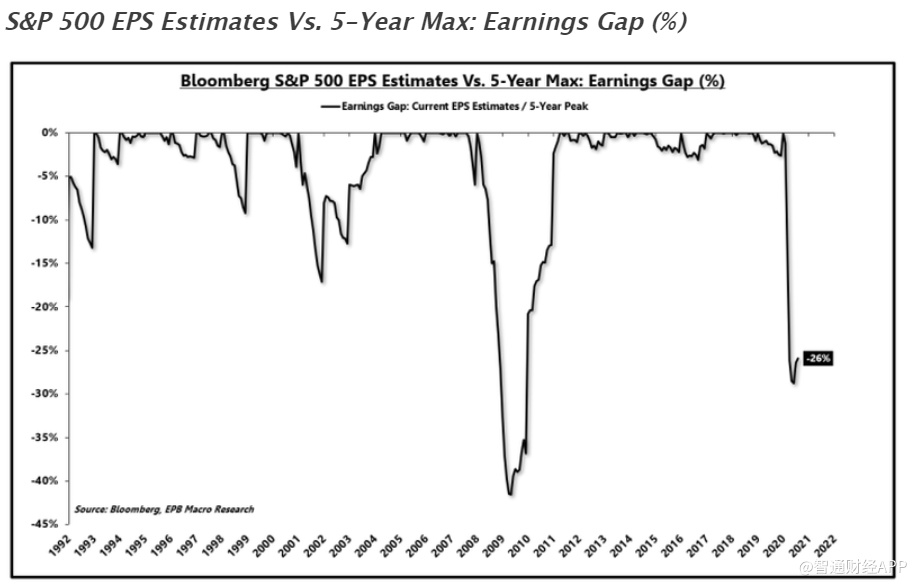 总体而言,市场需要及时缩小收益差值,以证明目前的市盈率水平是合理的。如果每股收益估值在两年内达到2020年2月的峰值,那么当前的上涨是合理的。