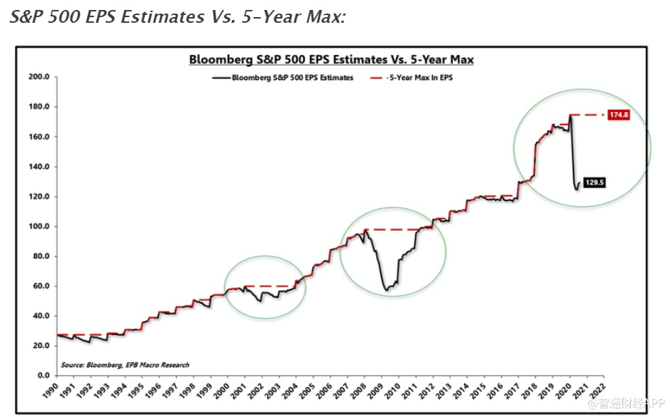 在每一个例子中,每股收益预期都花了大约3年时间才回到峰值水平。
