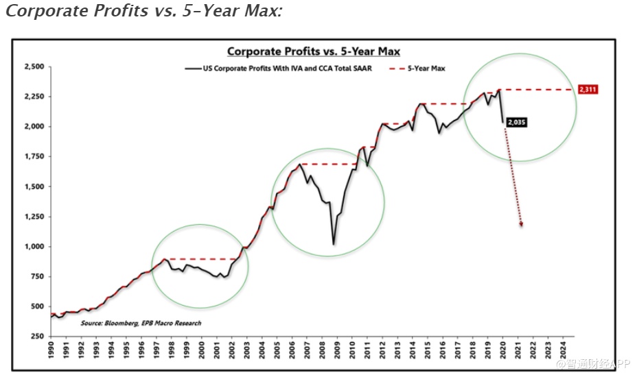 下图显示了企业税前利润(黑色部分)和5年最高税前利润(红色部分)。图表截止到2020年第一季度,分析师预计第二季度的收益差值会更大。